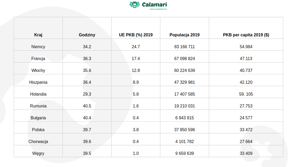 Jak można zauważyć, średnia liczba godzin pracujących w tygodniu w Unii Europejskiej wynosi 36.2. Najwięcej godzin pracują osoby zamieszkujące Rumunię – 40.5 godziny tygodniowo, najmniej zaś w Holandii – 29.3 godziny, czyli w praktyce dziesięć godzin w tygodniu mniej. W oparciu o raport na temat udziału krajów w europejskim PKB łatwo można zauważyć relacje zachodzące pomiędzy obowiązkową liczbą godzin do przepracowania, a wysokością procentową wskaźnika PKB.