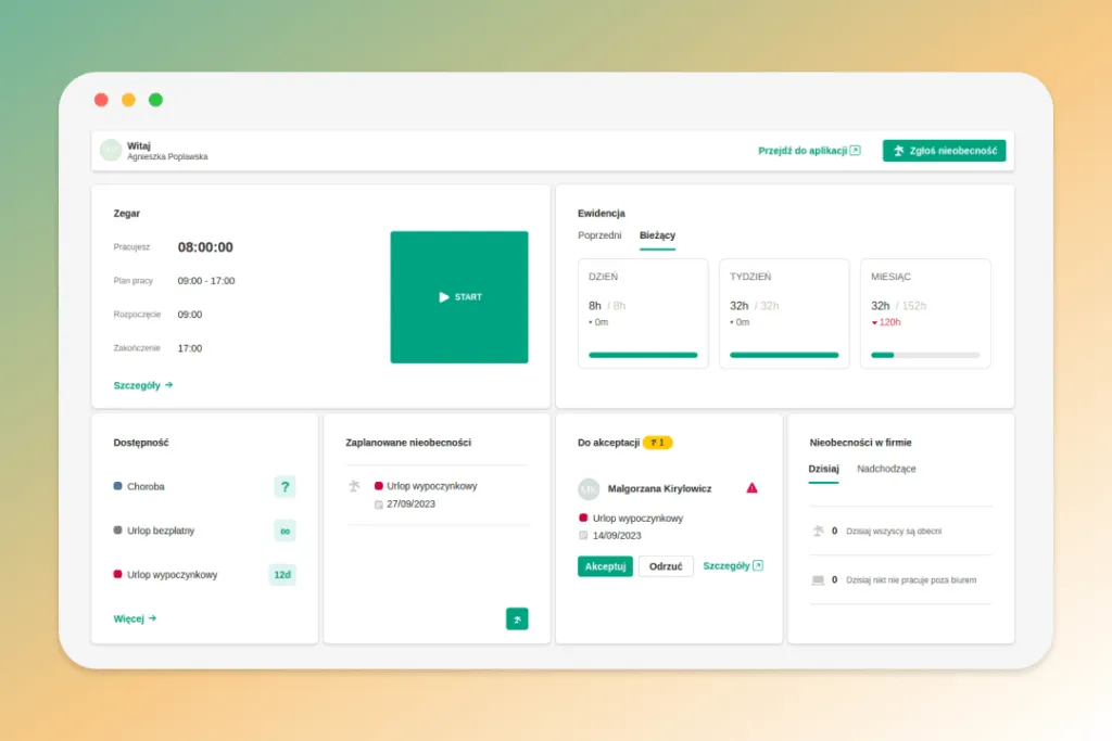 - Nieobecności w firmie – kafelek pokazujący, które osoby są nieobecne danego dnia lub w najbliższych dniach;