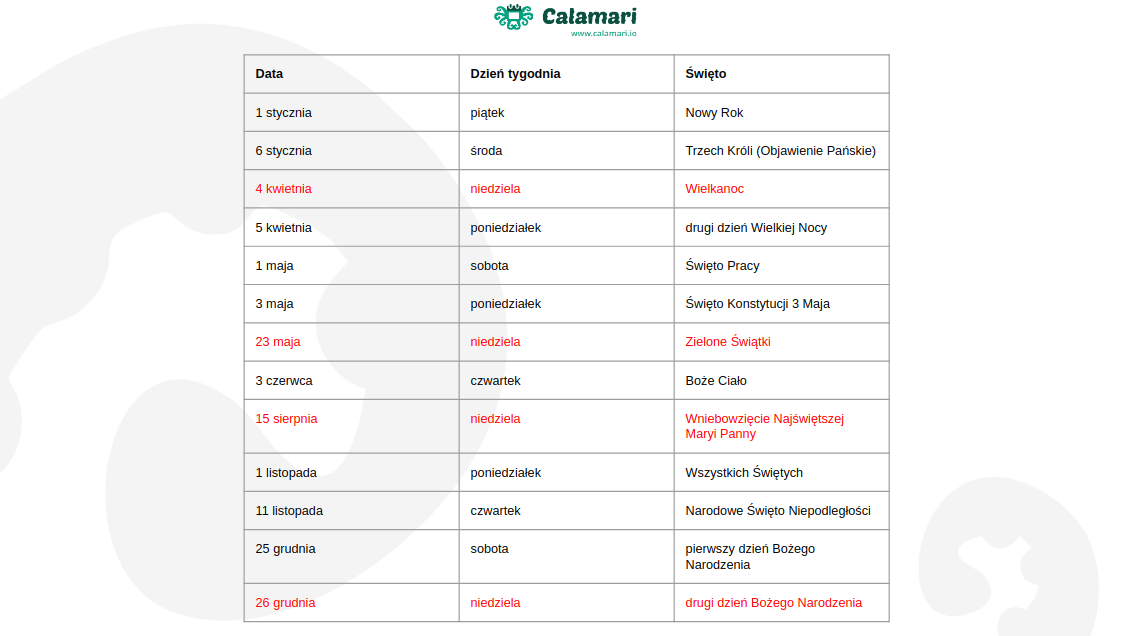 Planując pracę w firmie na kolejny rok, warto brać pod uwagę układ kalendarza świąt. Dzięki temu można uniknąć wielu problemów wynikających ze złej organizacji czasu, takich jak – opóźnienia w zakończeniu zadań, nieobecność kluczowych pracowników, przepracowanie zespołów. Dobre planowanie to również szansa na to, by budując w pracownikach dobre zdanie o firmie, wyjść im naprzeciw i zachęcić do odpoczynku w korzystnych dla nich warunkach.