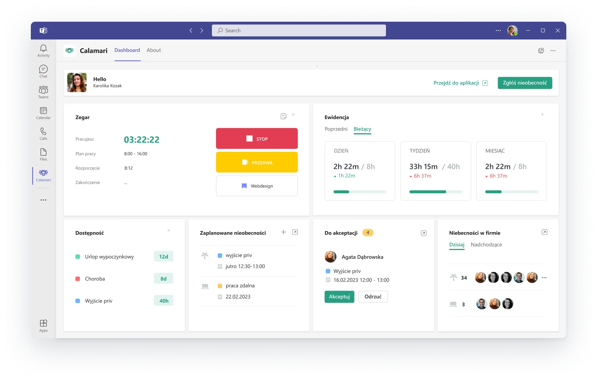 To nie tylko niedogodności – to zabójcy produktywności, które bezpośrednio wpływają na wyniki finansowe firm. W Calamari wierzymy, że integracja narzędzi HR z Microsoft Teams lub Slackiem może zmniejszyć przeciążenie techonlogiczne i poprawić produktywność. Na przykład dokładne śledzenie godzin pracy w tych narzędziach może ograniczyć błędy manualne i zapewnić sprawiedliwe wynagrodzenie, co dodatkowo redukuje chaos nadmiaru aplikacji i zwiększa efektywność.