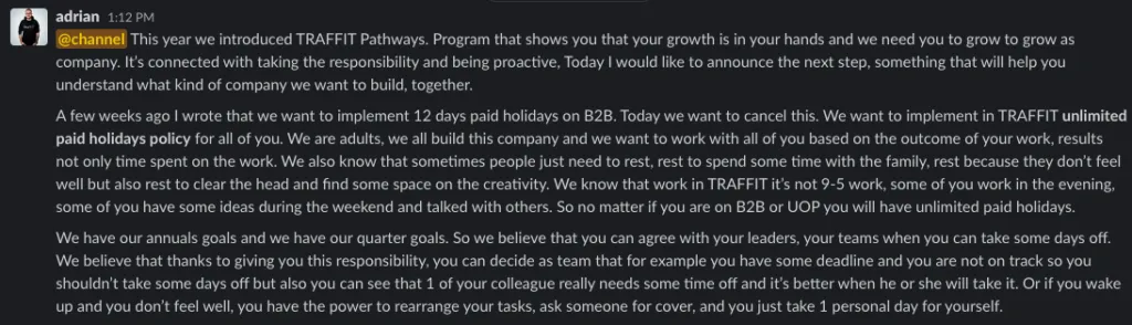 Anika: Pomysł o wprowadzeniu unlimited PTO wyszedł od Adriana Wolaka, CEO TRAFFIT oraz Micka Griffin, Chief of Growth. Zanim jednak został on wdrożony w życie, cały pomysł został przedyskutowany z managerami każdego z zespołów. Chcieliśmy wspólnie podjąć ostateczną decyzję z przekonaniem, że nie będzie to szkodziło żadnemu departamentów oraz że osoby zarządzające innymi osobami również widzą w tym korzyść.