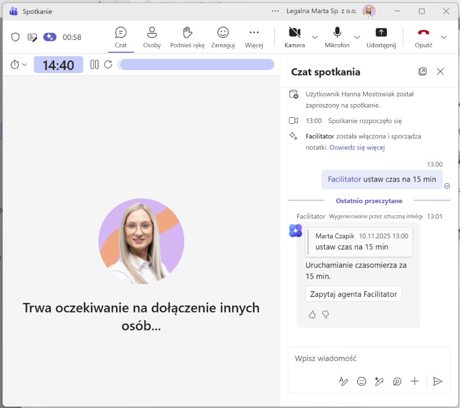 Facilitator to inteligentny asystent, który w czasie rzeczywistym generuje notatki, podsumowuje kluczowe punkty rozmów, zarządza zadaniami oraz wspiera tworzenie dokumentów na bazie rozmowy. Dostępny jest dla użytkowników z licencją Microsoft 365 Copilot w zaplanowanych spotkaniach.