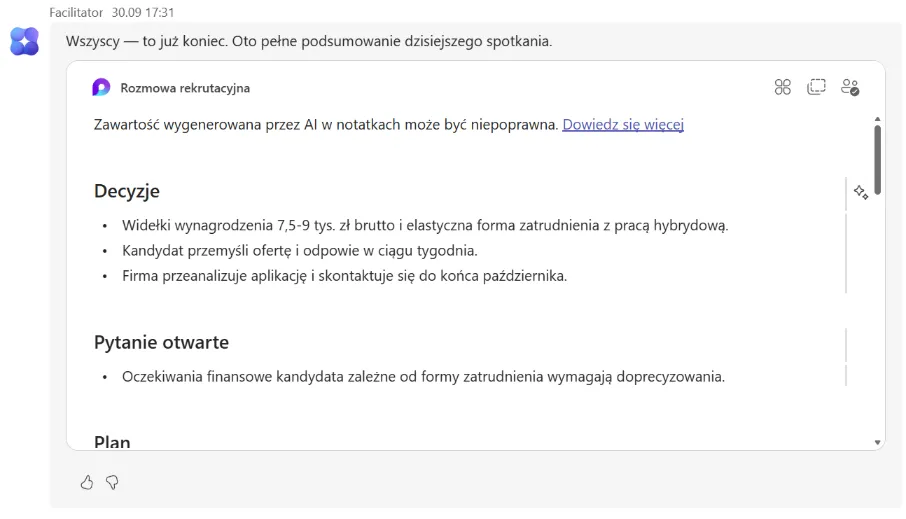 - Automatyczne notatki – podczas rozmowy rekrutacyjnej online Copilot tworzy notatki, podsumowując najważniejsze odpowiedzi i wnioski.