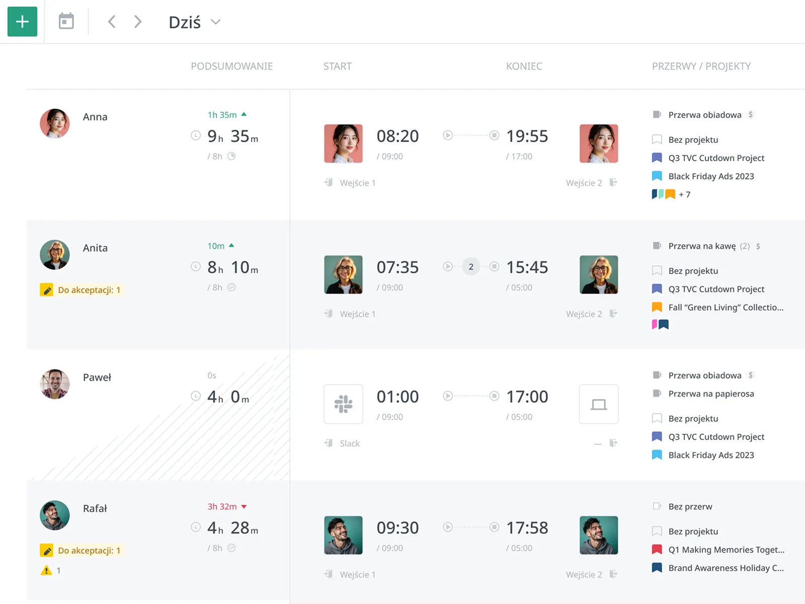 Lista obecności w czasie rzeczywistym — kto aktualnie pracuje, a kto jest nieobecny. Szybko zauważysz, jeśli ktoś nie rozpoczął jeszcze swojej zmiany.