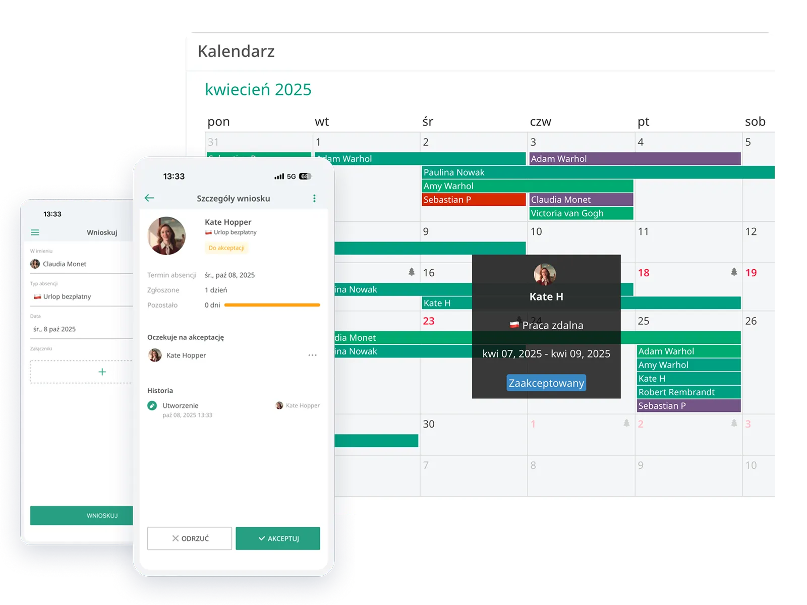 Przed zatwierdzeniem wniosku urlopowego menedżer od razu widzi kalendarz zespołu. Możesz upewnić się, że na obiekcie klienta będzie wystarczająca obsada, zanim udzielisz urlopu — bez ryzyka przerw w usługach.