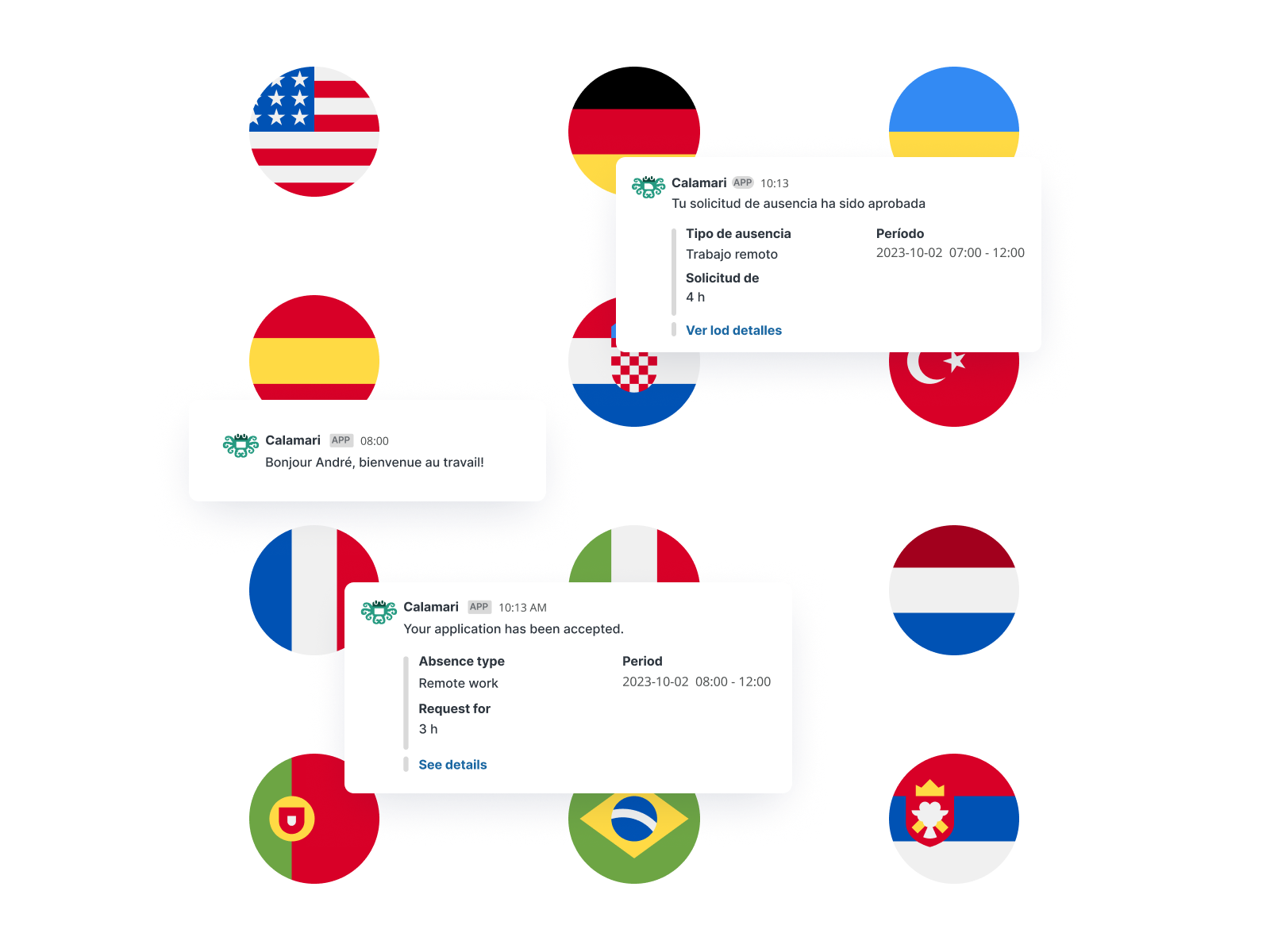 Twój zespół jest różnorodny — i Twoje oprogramowanie HR powinno łączyć, a nie dzielić. Calamari wspiera wielokulturowe zespoły, pozwalając każdemu pracownikowi korzystać z systemu w swoim języku ojczystym — ukraińskim, hiszpańskim, polskim czy angielskim.