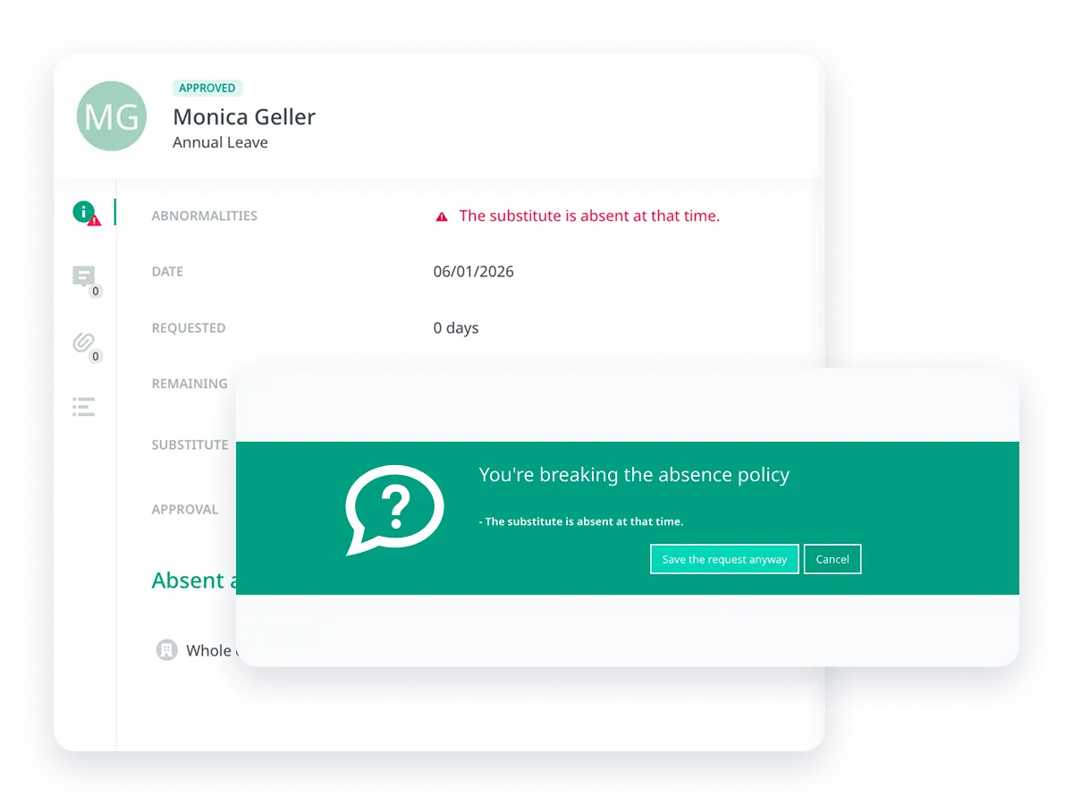 🔴 Zablokuj wniosek (wymuś zgodność): system całkowicie uniemożliwia wysłanie wniosku. Pracownik widzi dokładnie dlaczego (np. "Jesteś obecnie przypisany jako zastępca"). Zero błędów, zero dyskusji.