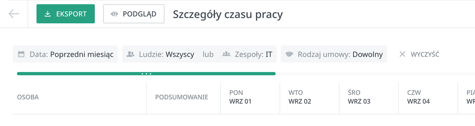 - Dane podstawowe: Planowany czas pracy, Czas przepracowany, Stosunek czasu pracy do planu, Święta, Suma widocznych elementów.