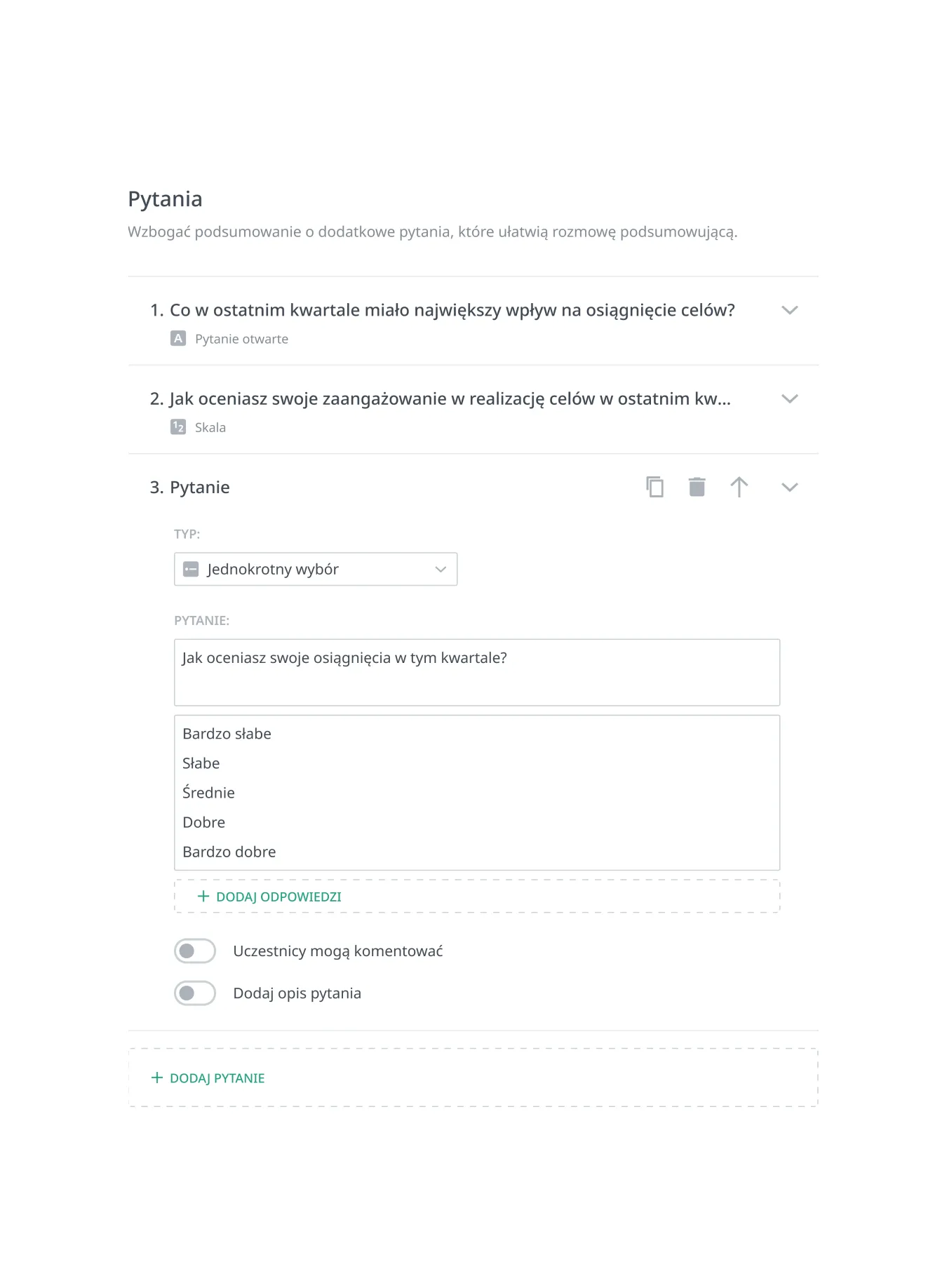 Twórz własne formularze z różnymi typami pytań (tekstowe, skala, jednokrotny/wielokrotny wybór) i definiuj własne skale ocen