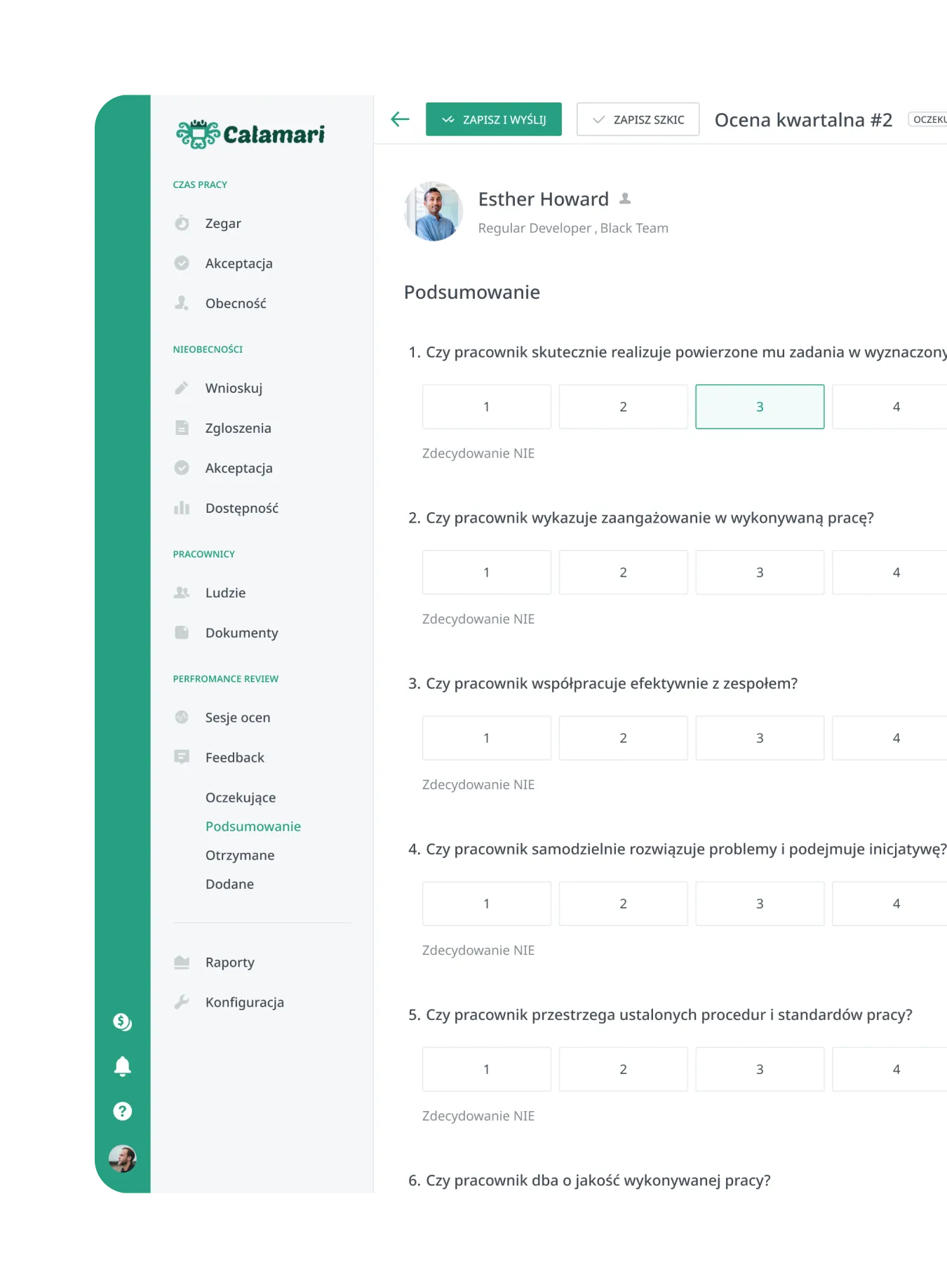 Zapomnij o rozbudowanych Excelach i wielu osobnych arkuszach odpowiedzi. W Calamari dostaniesz elastyczne, gotowe do użycia narzędzie, które przeprowadzi Cię przez proces ocen pracowniczych krok po kroku.